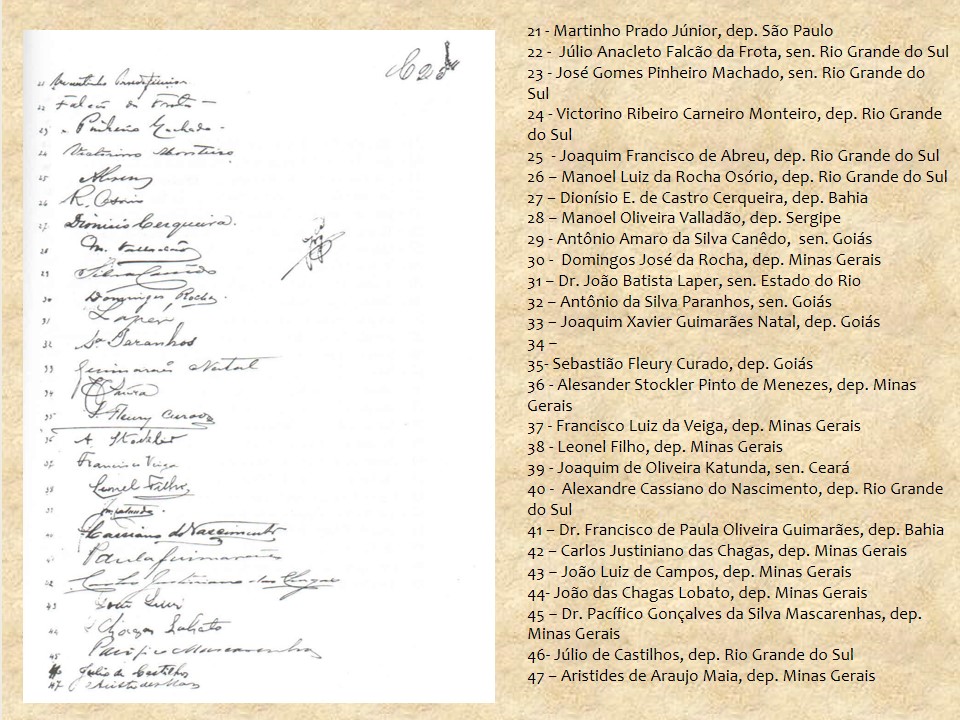 Relação dos Deputados Constituintes que elaboraram o anteprojeto da primeira constituição da república, promulgada em 1891. Abaixo, proposta aprovada numa sessão realizada em 15 de novembro de 1890, que deu origem ao artigo 3º da Constituição de 1891, autorizando a união reservar uma área no planalto central para a construção da nova capital. O passe seguinte foi dado em 1892, durante o governo de Floriano Peixoto, quando foi criada a Comissão Exploradora do Planalto Central, coordenada por Luiz Cruls.